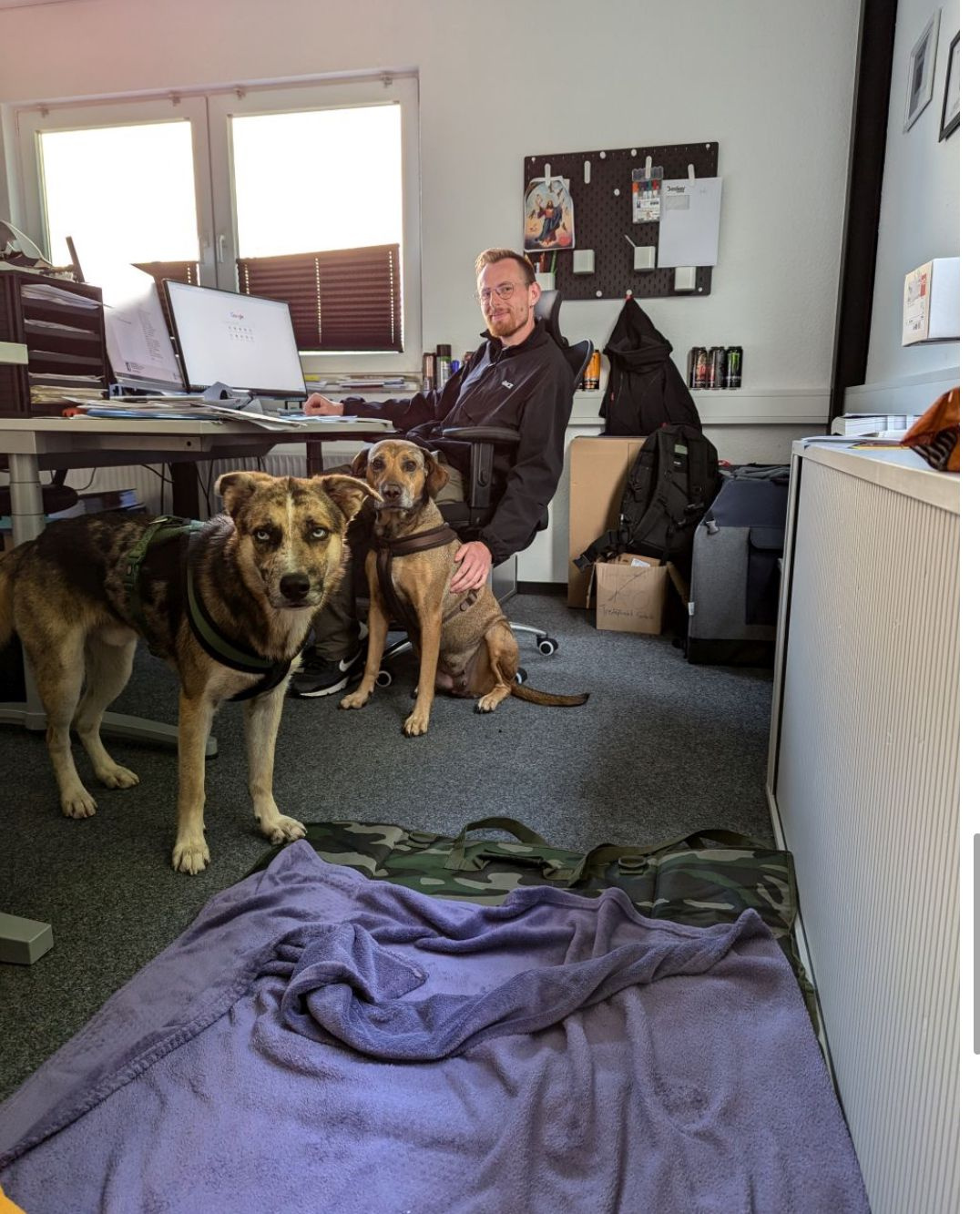 Ach ja, und arbeiten gehe ich mittlerweile auch. Ich gehe mit Coco und Papa derzeit ins Büro und unterstütze ihn tatkräftig bei der Arbeit... Auch wenn seine Kollegen meinen, dass man mich ja gar nicht merkt, weil Ich so ruhig bin und mich sofort entspannt ablege und schlafe... Wobei ich mir doch ab und an mal eine Streicheleinheit abhole... Mensch... So ein Hundeleben ist viel Arbeit! Meinen neuen Arbeitsonkel Alex finde ich übrigens toll.