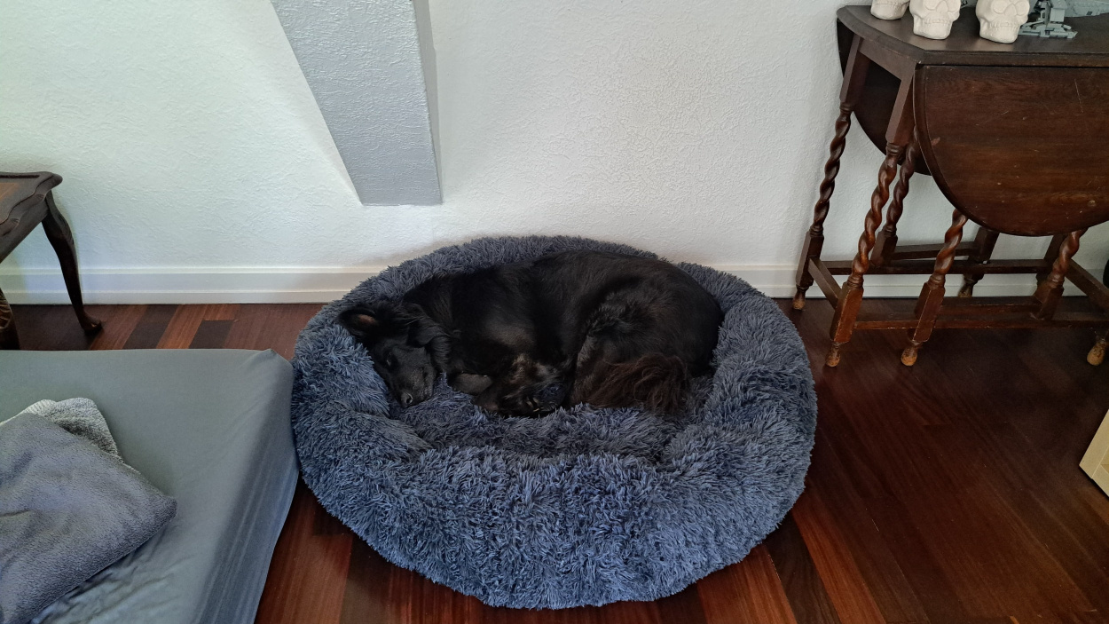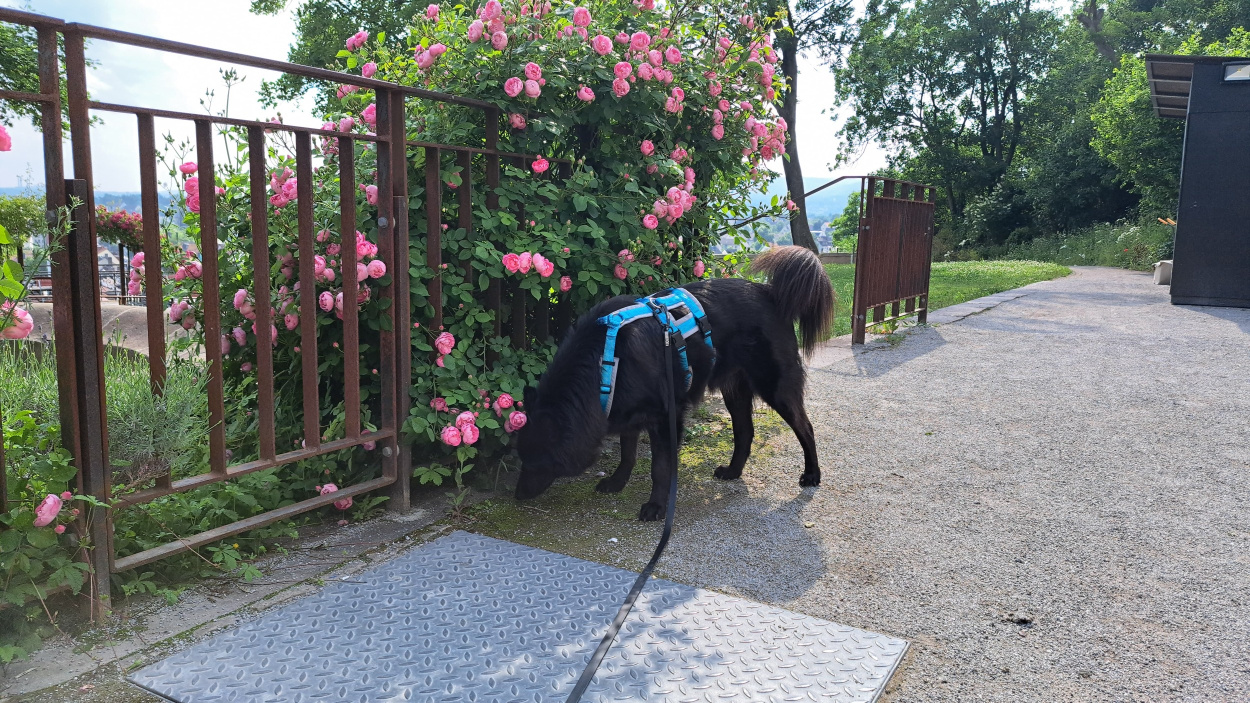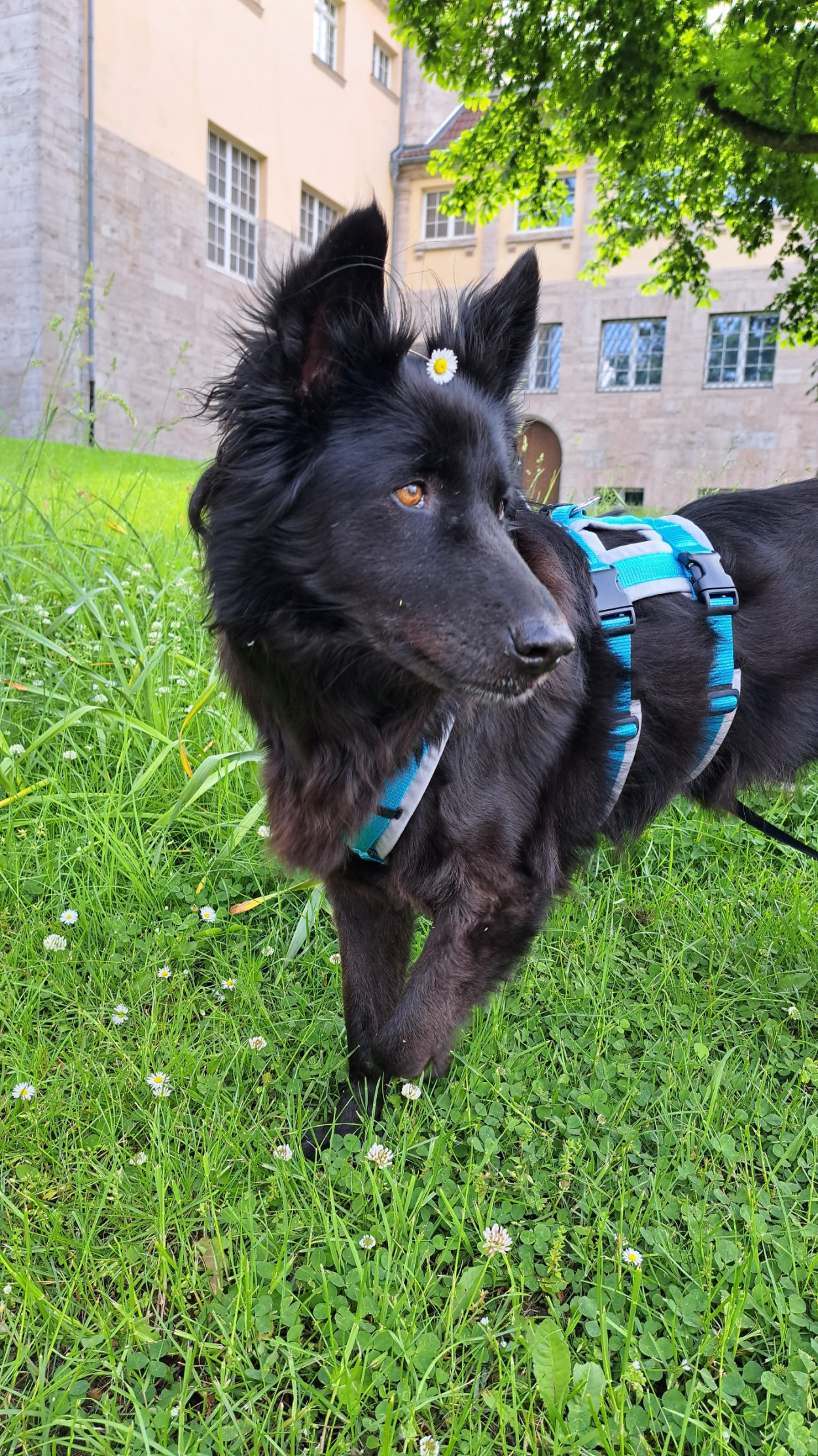 “Also nach 2 Wochen fühlt er sich langsam richtig wohl im neuen Zuhause, trägt stolz sein neues Geschirr und hat auch schon viele Komplimente bekommen, was für ein schöner Wolf er doch ist! Er lässt sich gerne den Kopf kraulen und macht sich gerne aufm Wohnzimmerteppich breit. Oder beobachtet vom Balkon sein Reich. Stellt sich raus, er ist ein ganz schöner Morgenmuffel - lieber noch ein kurzes Nickerchen machen und sich kraulen lassen, bevor es morgens raus geht!"