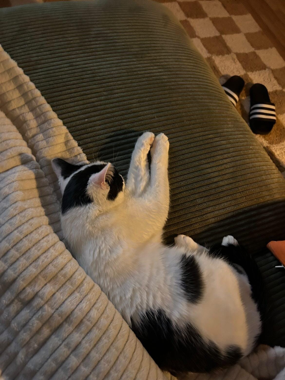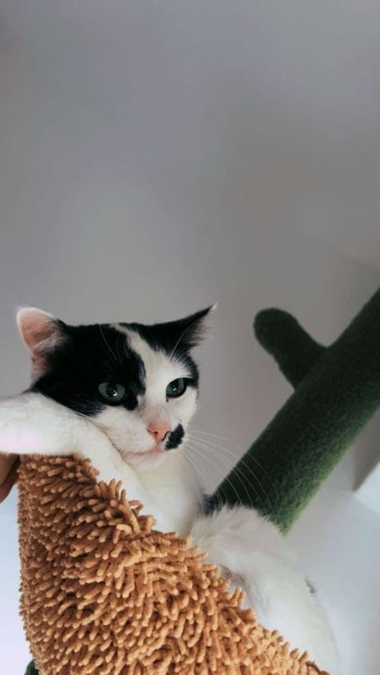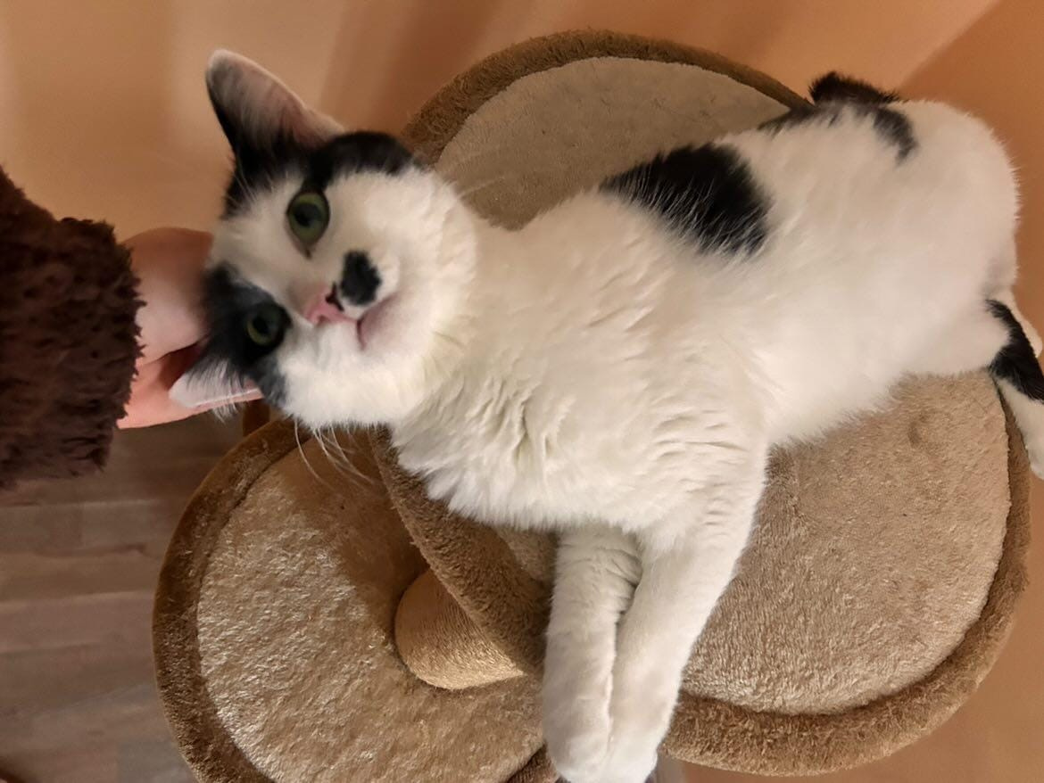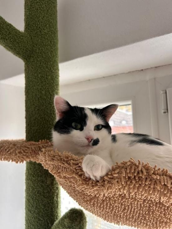 ich wollte euch kurz berichten, dass ich gut in meinem neuen Zuhause angekommen bin und mich von Anfang an wohlgefühlt habe. Am liebsten liege ich auf meinem Thron und beobachte die Welt draußen, wenn ich nicht gerade ein Nickerchen mache. Mit meinem neuen Herrchen auf dem Sofa zu kuscheln, gefällt mir aber auch sehr. Das Futter hier schmeckt mir besonders gut, ich kann gar nicht genug davon kriegen!