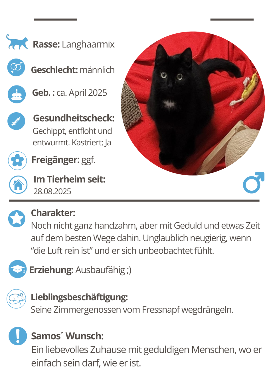 Ich kam damals als winziges Kitten mit meiner wilden Mama hier an. Sie lebt inzwischen wieder draußen an der Futterstelle, kastriert, umsorgt und – ganz ehrlich – ziemlich zufrieden mit ihrem Leben. Okay, ich bin ja jetzt auch schon groß und kann langsam auf eigenen Pfötchen stehen. Deshalb habe ich jetzt auch beschlossen, etwas gesellschaftlicher zu werden. Nicht zu viel, ich will ja meinen mysteriösen Ruf nicht ruinieren. Aber wenn Menschen ruhig, geduldig und nett sind (und idealerweise was Leckeres in der Hand haben), dann traue ich mich sogar mal hin. Ich tu’ dann einfach so, als wäre ich nur zufällig in der Nähe… eigentlich find ich das dann sogar ganz schön - aber verratet es keinem!